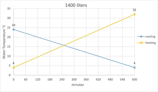 Graphique montrant le refroidissement et le chauffage de 1400 L d’eau du bain de glace par le refroidisseur